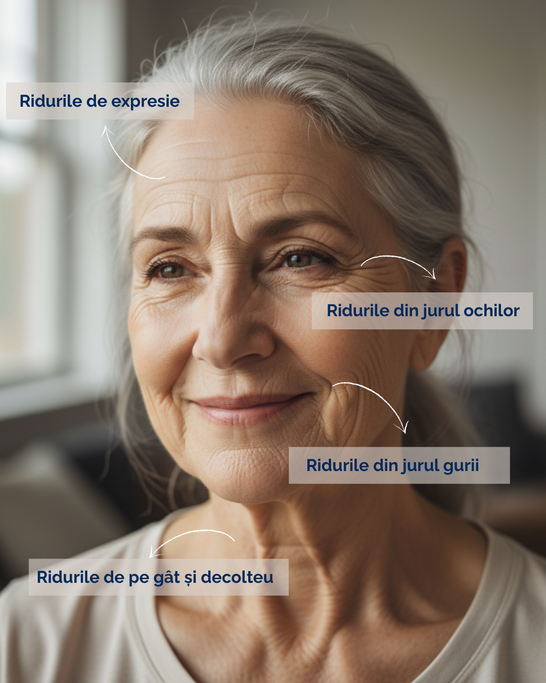 • micsorarea oaselor si pierderea grasimii poate duce la aparitia ridurilor. aceste modificari din organismul nostru fac ca pielea sa “se lase” si sa nu mai fie atat de ferma.