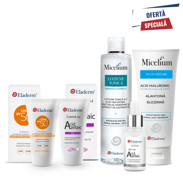 Pentru a veni în întâmpinarea celor care se confruntă cu rozaceea și sensibilitatea asociată, am creat o rutină completă, în care fiecare produs lucrează sinergic pentru a liniști pielea, a diminua roșeața și a menține nivelul optim de hidratare. Ingrediente-cheie precum Acidul Hialuronic, Niacinamida și Acidul Azelaic contribuie la reducerea iritațiilor și a inflamației, uniformizarea aspectului pielii și susține regenerarea celulară, fără a încărca sau agresa tenul.