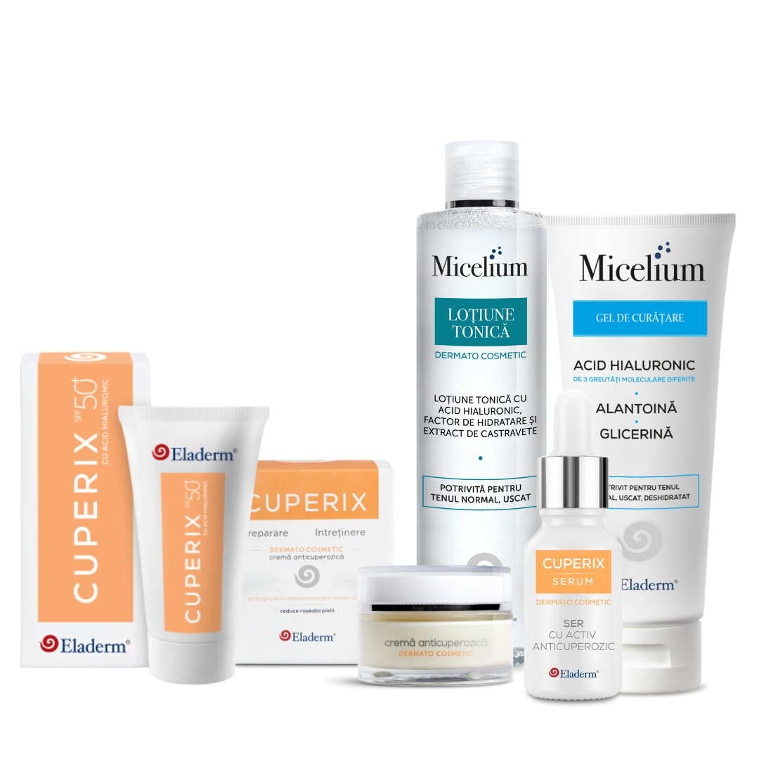 Rutina anticuperozica completa presupune utilizarea celor 5 produse existente in acest pachet, produse care asigura atat curatarea tenului cat si hidratarea si protectia solara. Pentru crearea acestui pachet au fost alese o selectie de produse a caror ingrediente actioneaza tintit asupra problemelor care duc la aparitia cuperozei. Gama Cuperix are la baza ingredientul activ NIO-TROX care, prin multipla sa actiune, reduce roseata si fragilitatea capilara.