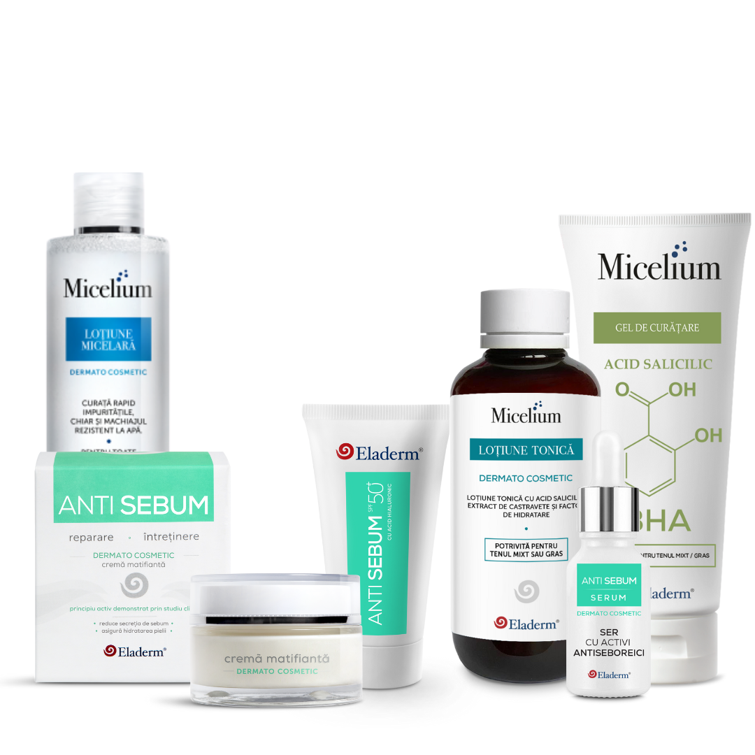 Rutina completa a unui astfel de ten contine produse cu texturi lejere dar si cu un continut optim de ingrediente antiseboreice care sa actioneze tintit asupra problemelor cu care se confrunta. Rutina Antisebum cu produse Eladerm contine 6 produse care acopera toate nevoile acestui tip de ten: de la demachiere, curatare, hidratare, reglarea secretiei de sebum la protectia solara. Toate, avand texturi lejere, care se absorb rapid in piele, fara sa o incarce.